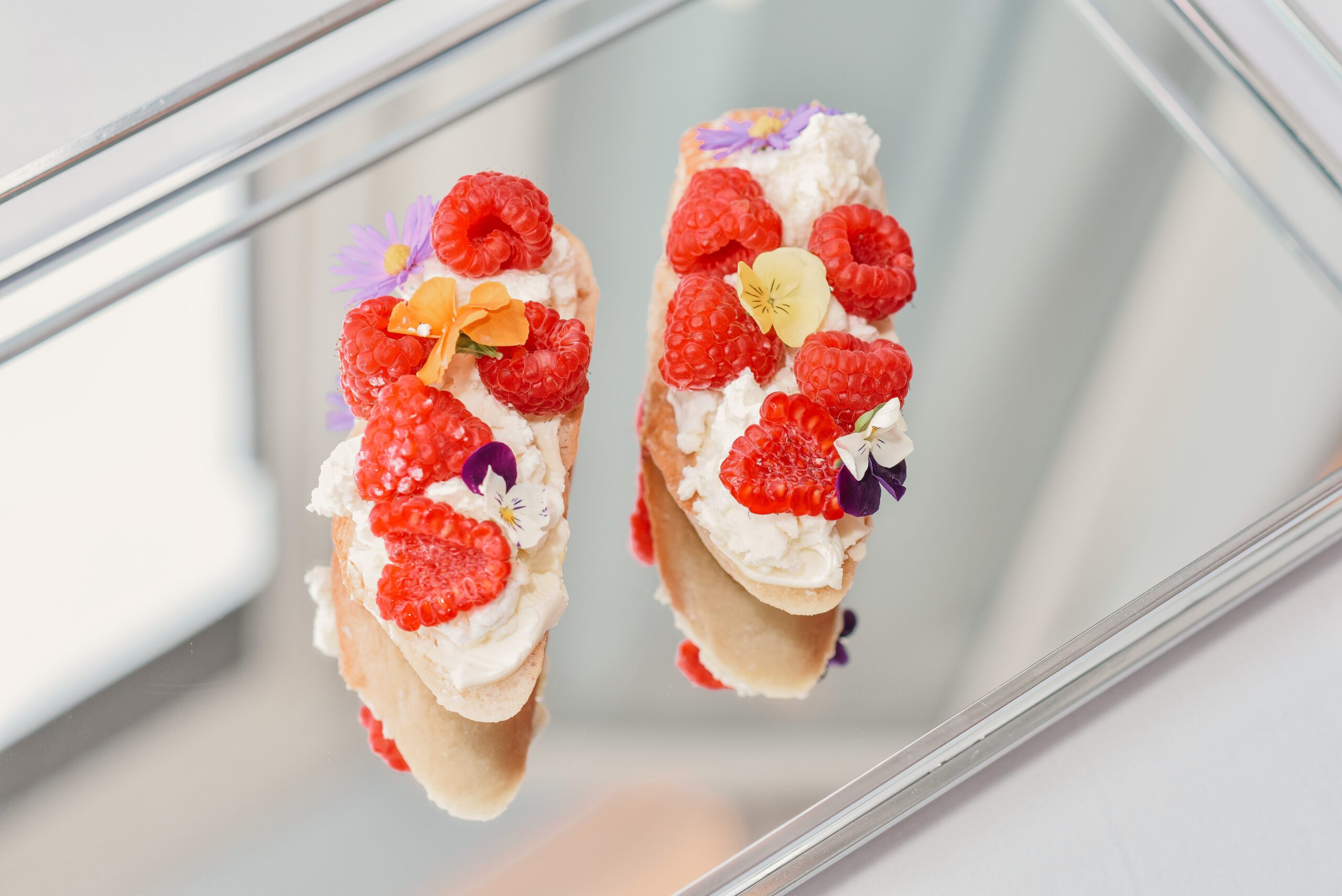 Pečivo z pece, máslo, jemný kozí sýr Bettinehoeve BV, sezónní ovoce, med, mandle, jedlý dekor.